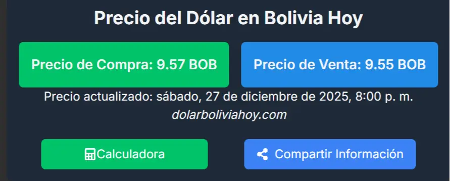 Según este sitio, la divisa norteamericana se cotiza con un precio de venta de 9,55 bolivianos (BOB), mientras que el precio de compra alcanza los 9,57 BOB, reflejando un ligero ajuste respecto a la jornada anterior.